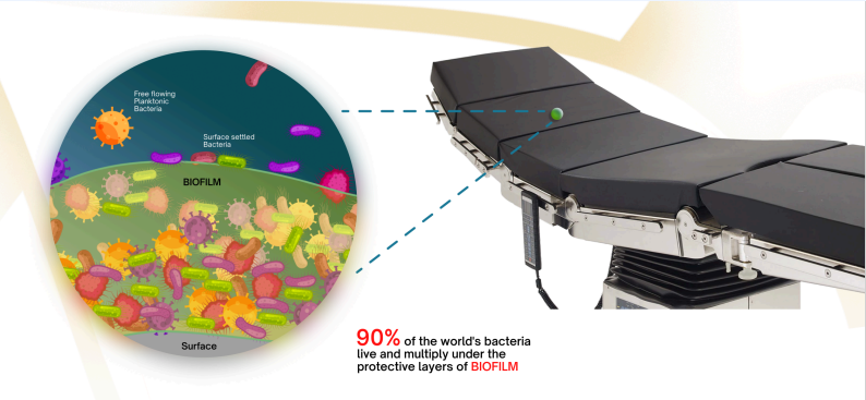More than air-born atmospheric contaminates,hospitals have hidden surfaces inaccessible for conventional cleaning.Inside surgical equipment,under the bed, behind furniture, walls,ceilings,AC ducts,and light fixtures are usually impossible to clean. These surfaces are the source of biofilm formation. Biofilms are the protective layer underneath which bacteria and viruses hide and multiply.